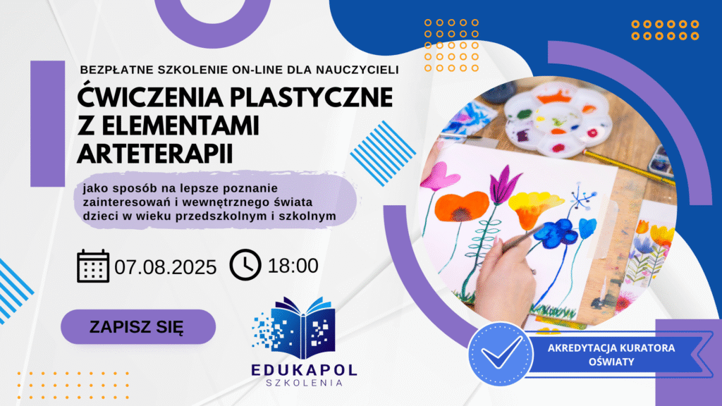 Zaświadczenie drukowane do szkolenia „Ćwiczenia plastyczne z elementami arteterapii jako sposób na lepsze poznanie zainteresowań i wewnętrznego świata dzieci w wieku przedszkolnym i szkolnym”