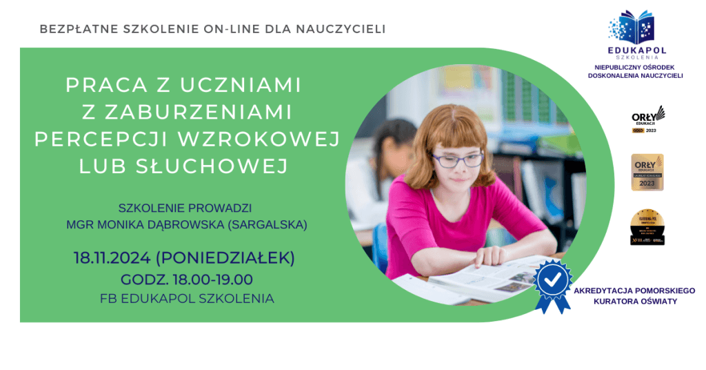 Zaświadczenie do szkolenia „Praca z uczniami z zaburzeniami percepcji wzrokowej lub słuchowej”